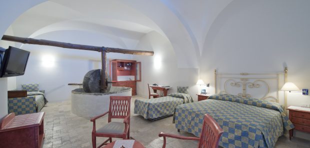 Dating back to the 17th century, the villa showcases stunning architecture that retains its romantic and dramatic elements. The private and shared terraces are adorned with striking high arches, while the sleeping chambers boast elegant domed ceilings that reflect the region's authentic style. The original stone wheel and press have been preserved as a tasteful centerpiece in our grand suite.